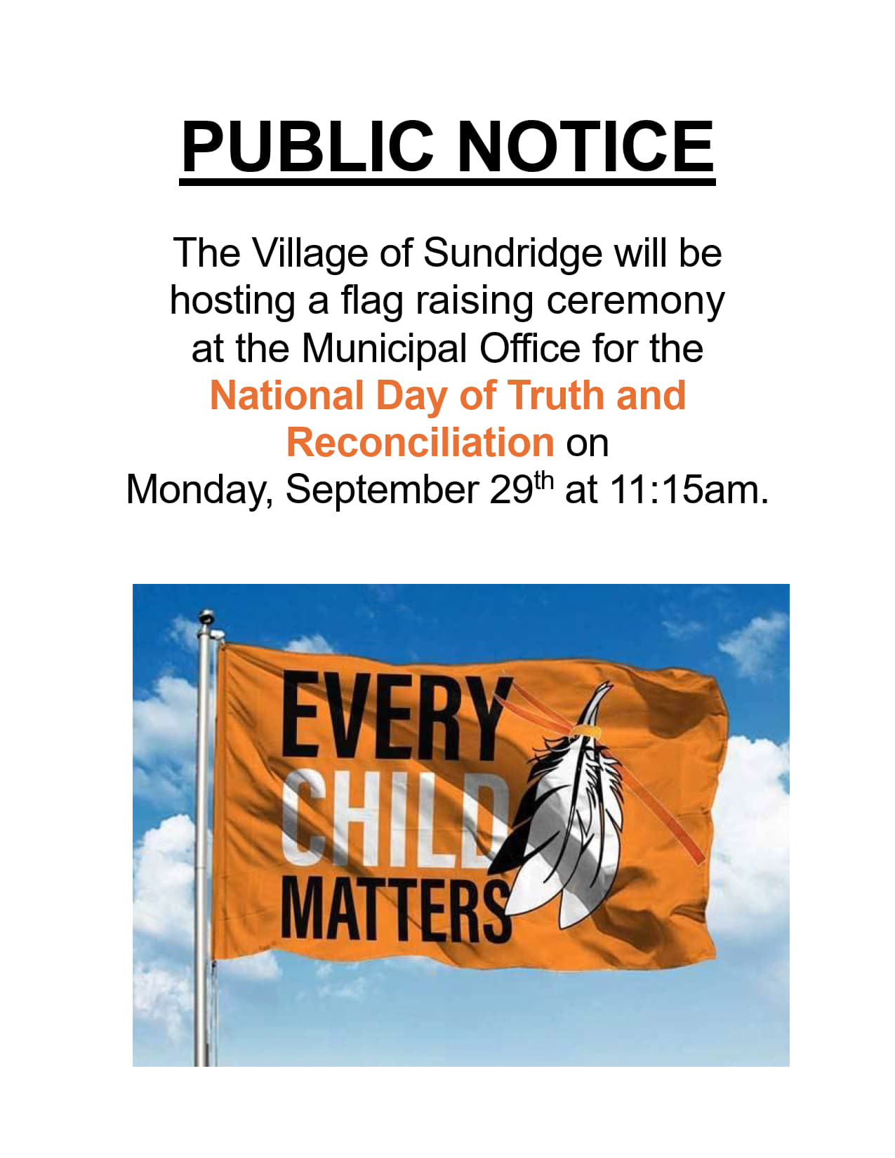 Council for the Village of Sundridge invites you to join us at the Flag Raising Ceremony for the Every Child Matters Flag, Monday September 29, 2025 at 11:15am. The Ceremony will take place at 110 Main Street.